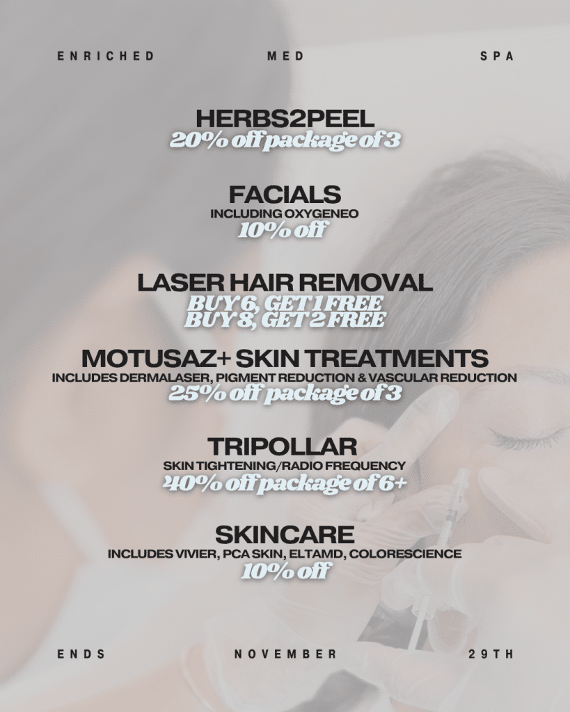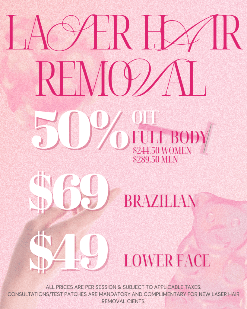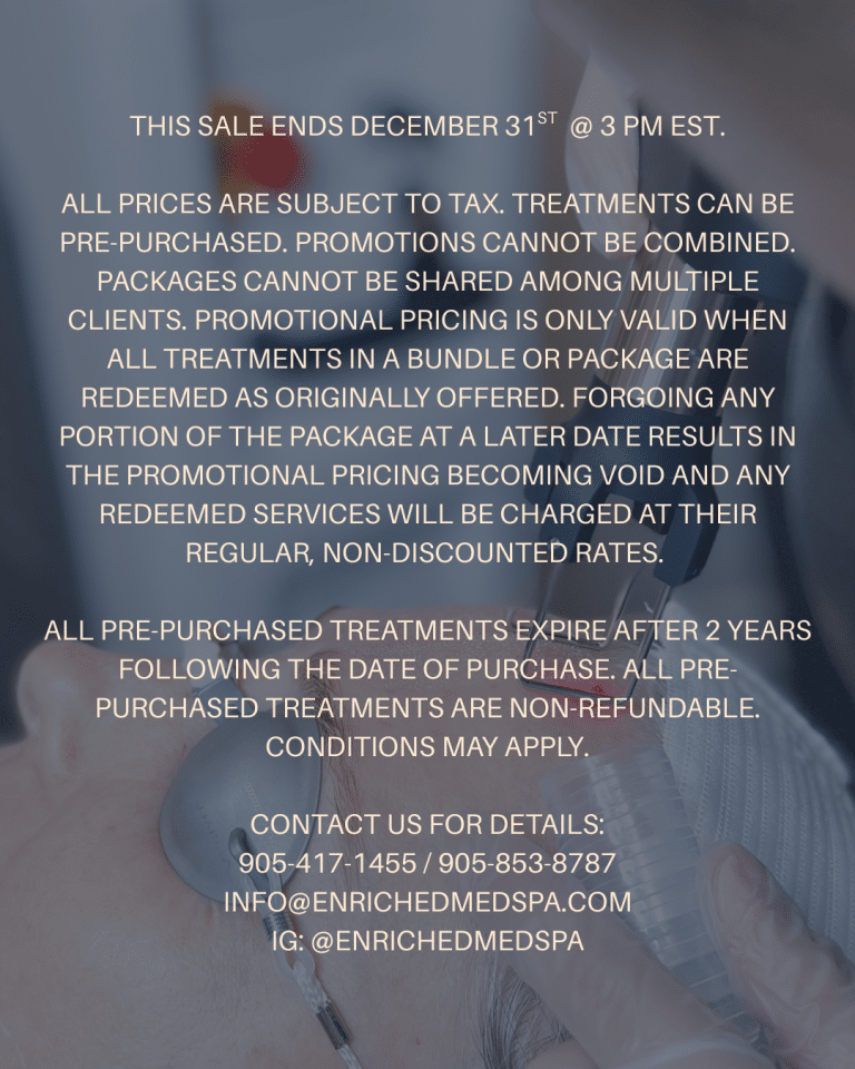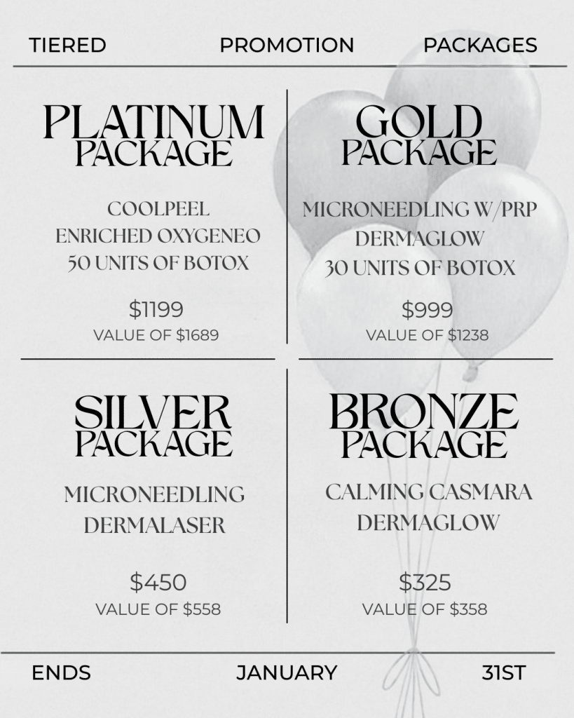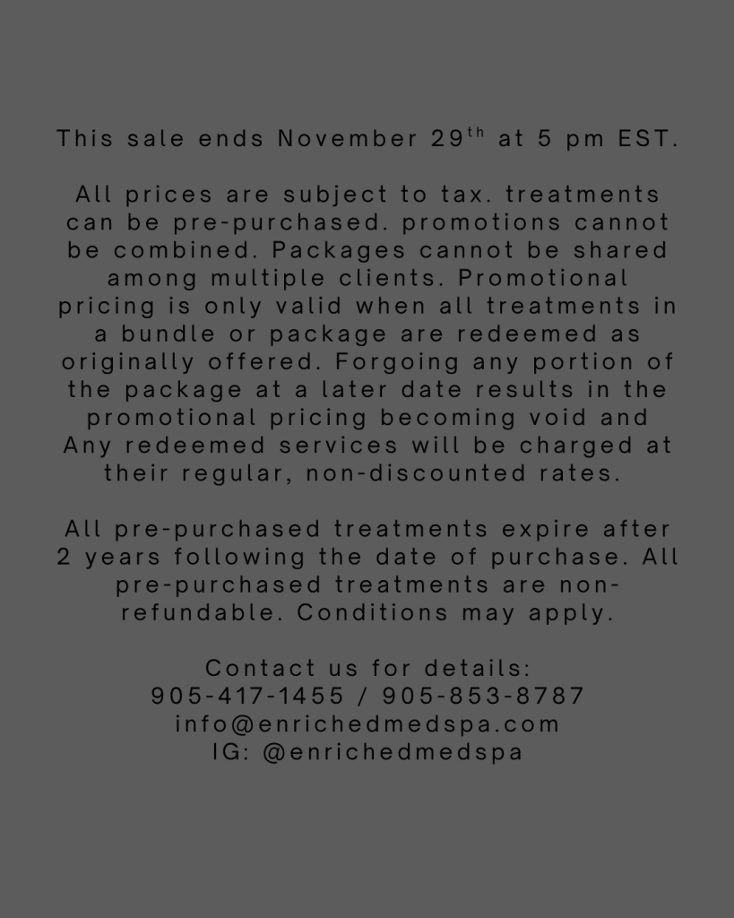 Terms and conditions: Promotional pricing is only valid when all treatments in a bundle or package are redeemed as originally offered. If a client chooses to forgo, exchange, or request a credit for any portion of the bundle, the promotional pricing becomes void. Any redeemed services will be charged at their regular, non-discounted rates, and the remaining balance (if any) will be adjusted accordingly.