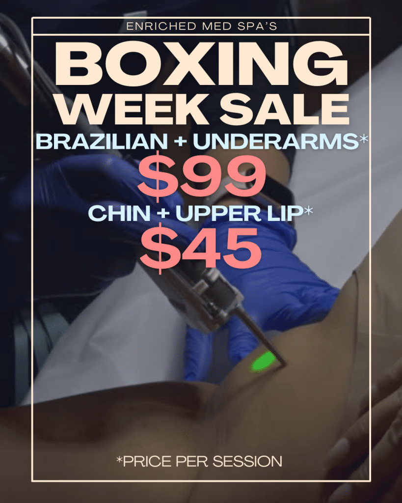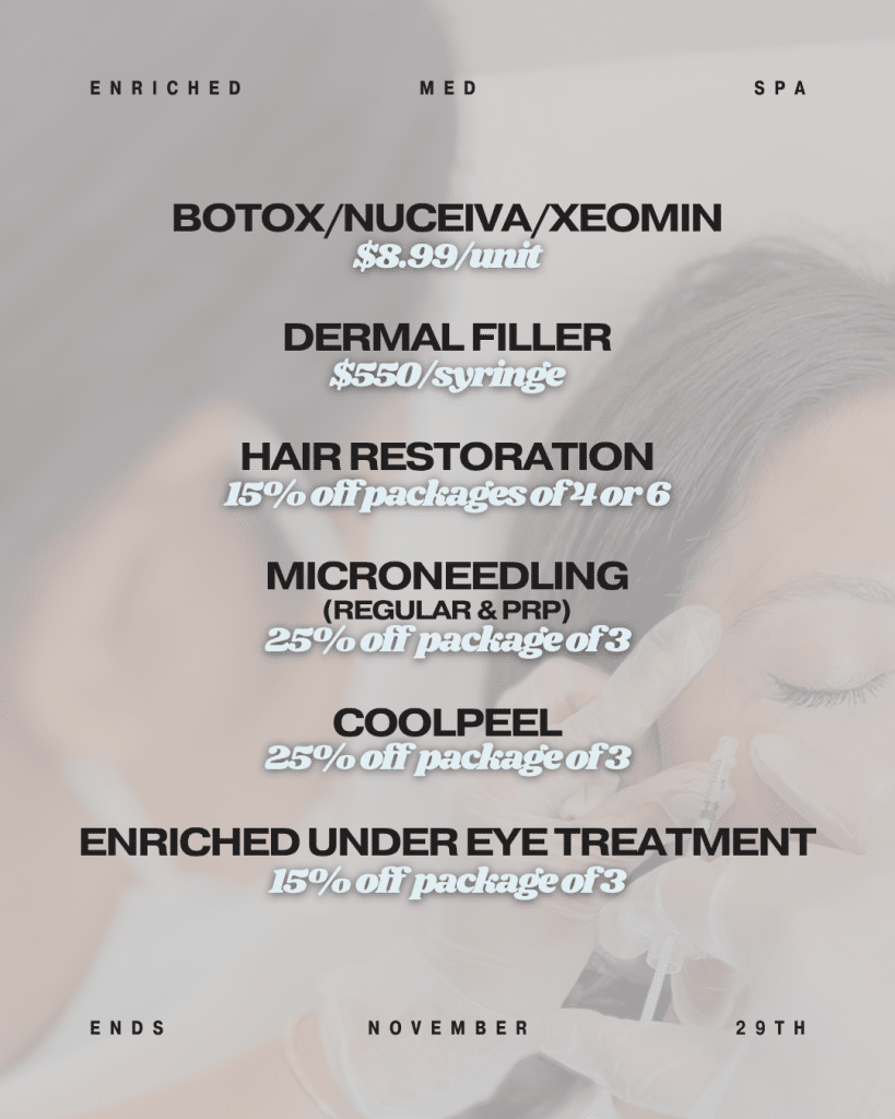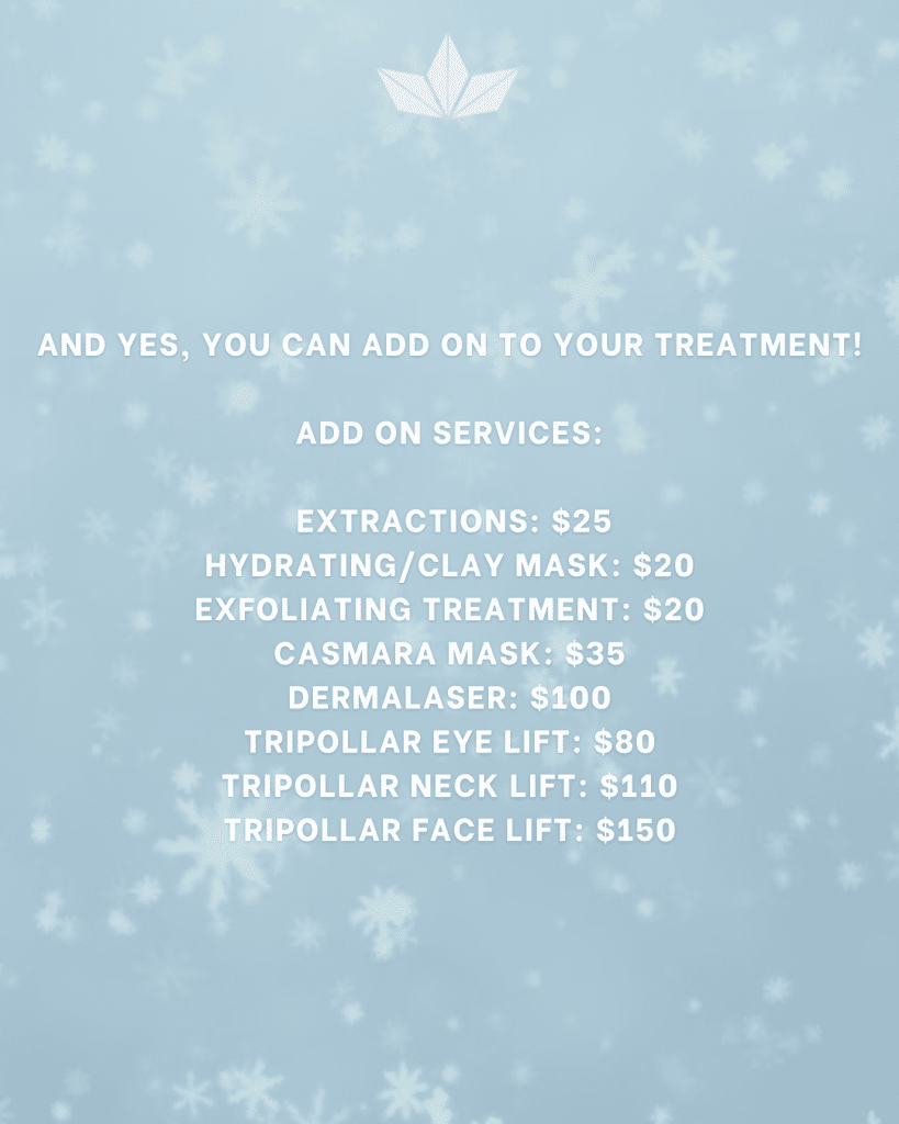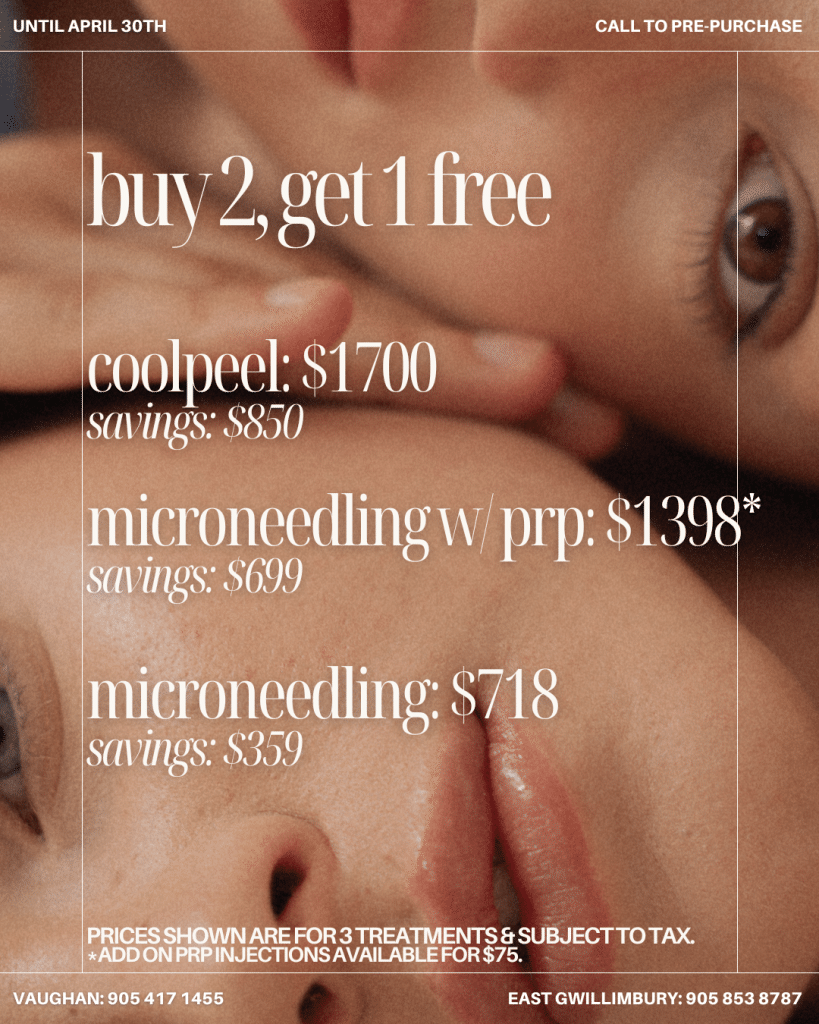 Terms and conditions: Promotional pricing is only valid when all treatments in a bundle or package are redeemed as originally offered. If a client chooses to forgo, exchange, or request a credit for any portion of the bundle, the promotional pricing becomes void. Any redeemed services will be charged at their regular, non-discounted rates, and the remaining balance (if any) will be adjusted accordingly.